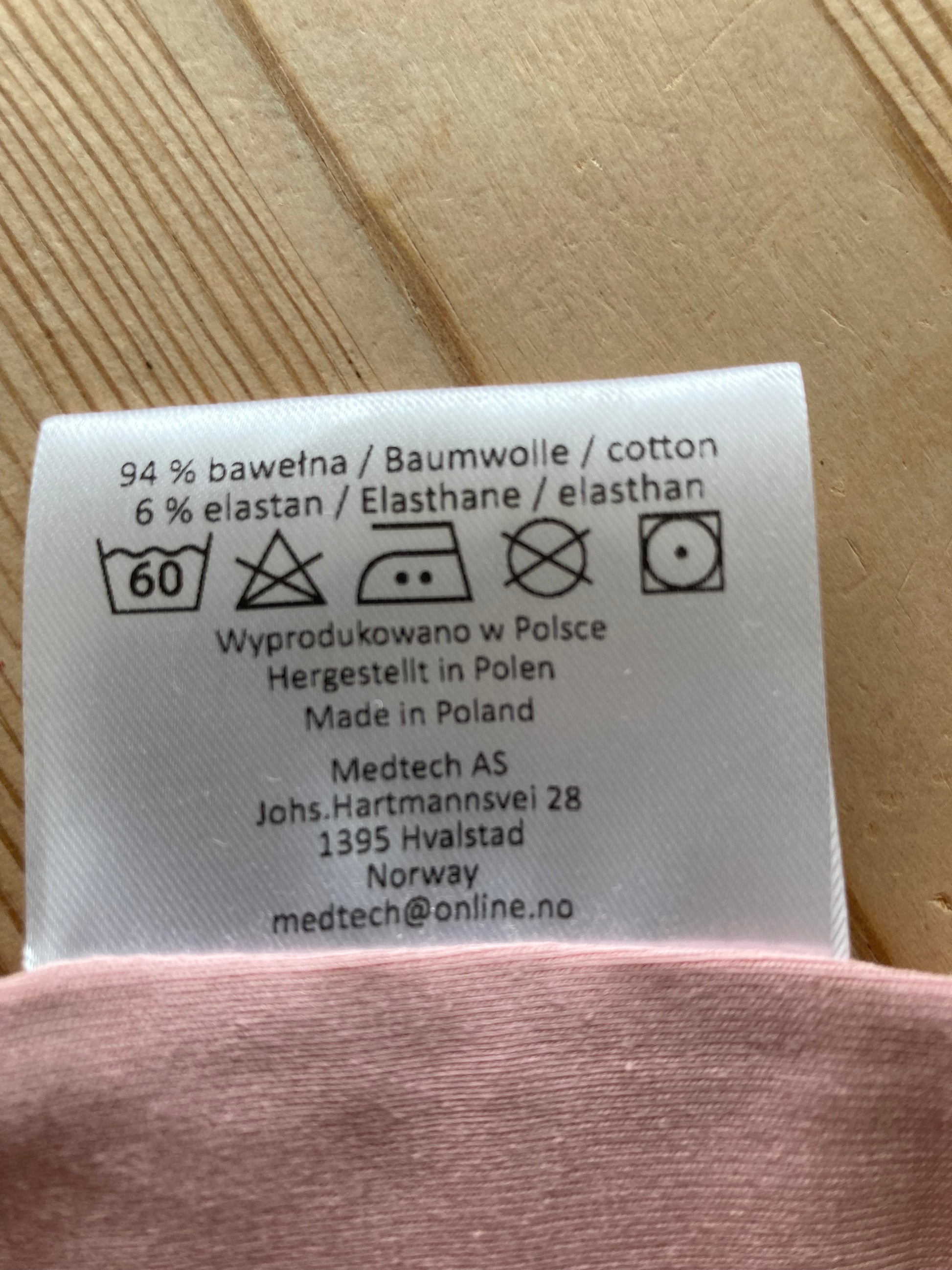 Materiale: 94% Bomull og 6% Elastan. Kan vaskes på 60 grader.